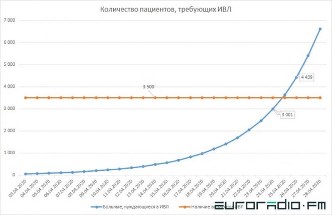 Но даже при самом оптимистичном сценарии — 25 апреля будет достигнут предел возможностей по обеспечению больных аппаратами ИВЛ, а уже на следующий день 800 человек могут умереть.