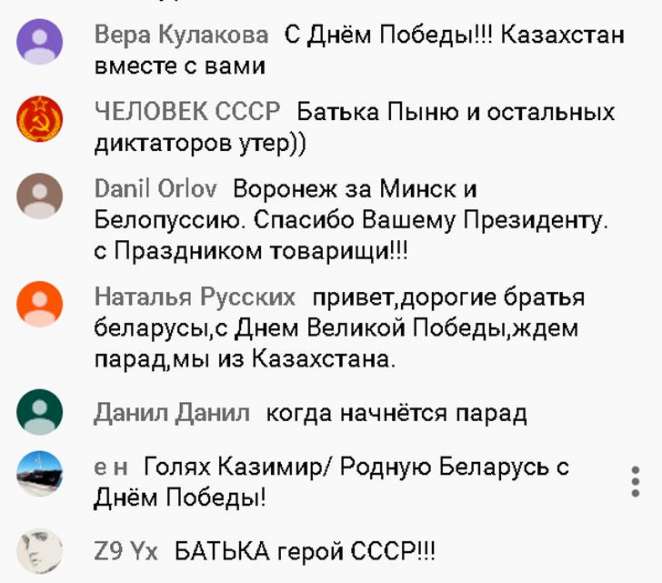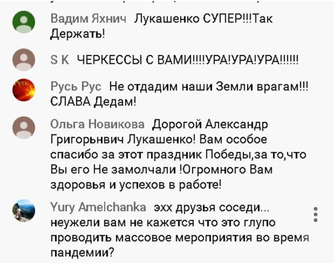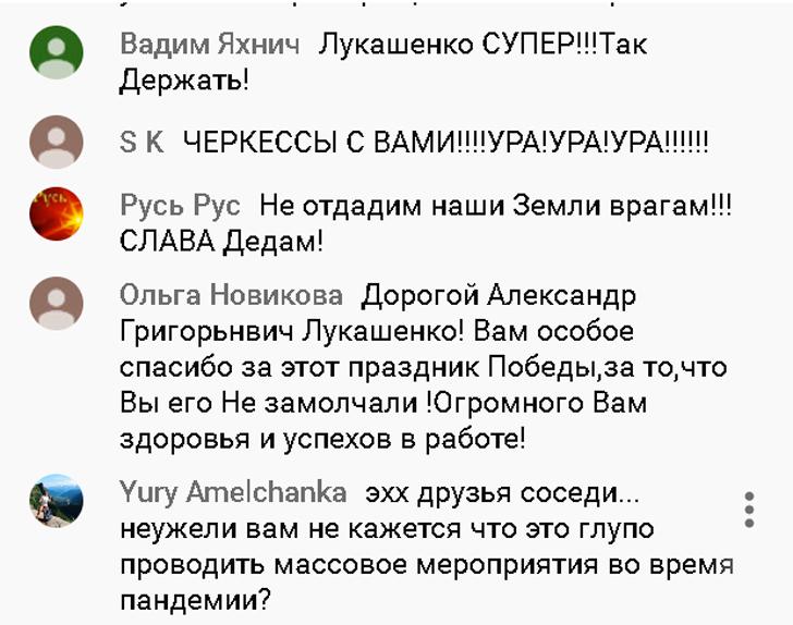 Не стоит забывать, что россияне провели последний месяц в принципиально иных условиях, нежели белорусы: жесткий карантин, QR-коды, масочный режим и т.п. В РФ, особенно среди оппозиционно настроенного электората, в моде призывы к смягчению или отмене карантина, возобновлению работы предприятий, учреждений и прежде всего МСБ. В коммунистической, левопатриотической и даже в либеральной среде звучат примерно те же упреки в адрес Владимира Путина, что и от Александра Григорьевича: мол, «спрятался в бункере», отменил парад в Москве, утратил контроль над страной, экономическую помощь оказывает только олигархам и т.п. На этом фоне Лукашенко и его антикоронавирусные экзерсисы начинают выглядеть привлекательно. Для президента РБ это шанс мягко поддавить партнера общественным мнением и заодно вернуть расположение тех электоральных групп в РФ, которые разочаровались в нем в 2015-20гг. Да и просто люди с выраженной советской идентичностью искренне радуются трансляции парада из Минска - посмотрите комментарии на YouTube и в соцсетях. Так что под прицелом Александра Григорьевича и Россия, и все постсоветское пространство.