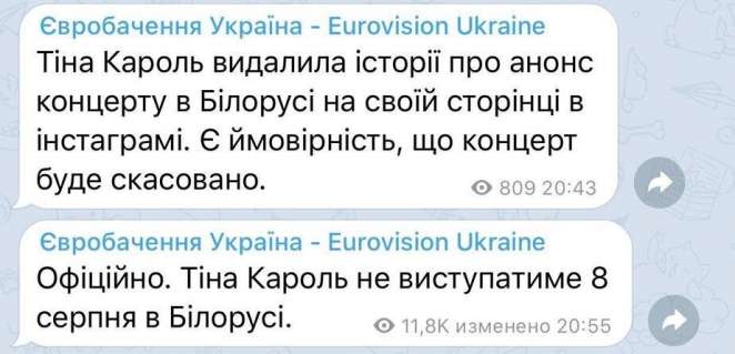 Тина Кароль удалила все анонсы мероприятия 8 августа в Бобруйске (также появилось официальное заявление в паблике украинского Евровидения, что она не приедет).