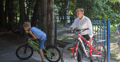 Андрей Дмитриев приехал голосовать в деревню Волковичи Дзержинского района на велосипеде, с сыном. У кандидата в президенты на руке белая лента.Фото: Радыё Свабода