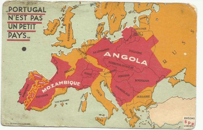 Плакат «Португалия — не маленькая страна»: на карту довоенной Европы наложены очертания владений государства в Африке и Азии