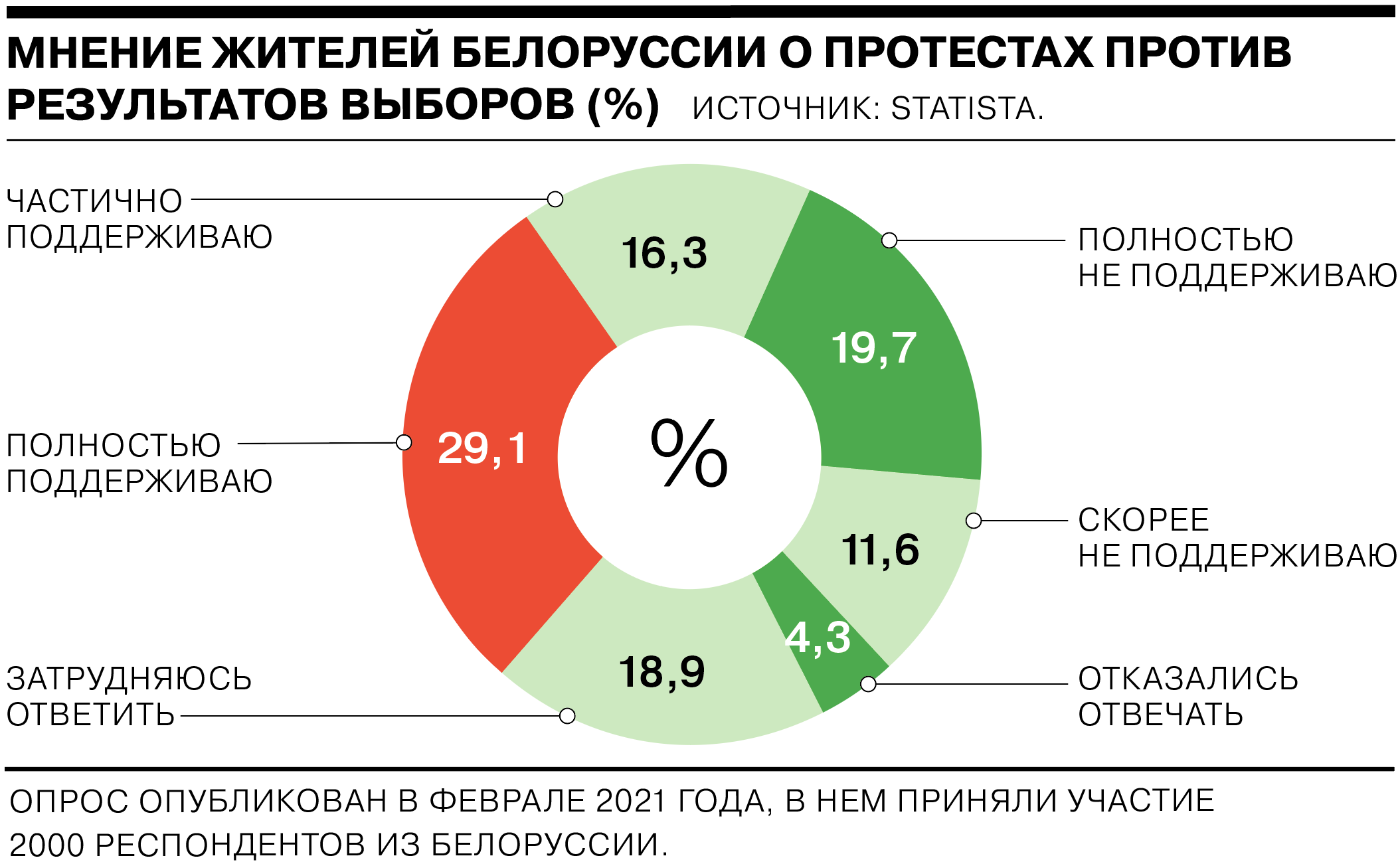 В феврале 2021 года берлинский Центр восточноевропейских и международных исследований (ZOiS) опубликовал итоги опроса об отношении белорусов к протестам. Он проводился через интернет и только среди жителей городов с населением больше 20 тыс. человек. По данным центра, 45% горожан, имеющих доступ к интернету, скорее на стороне оппозиции.