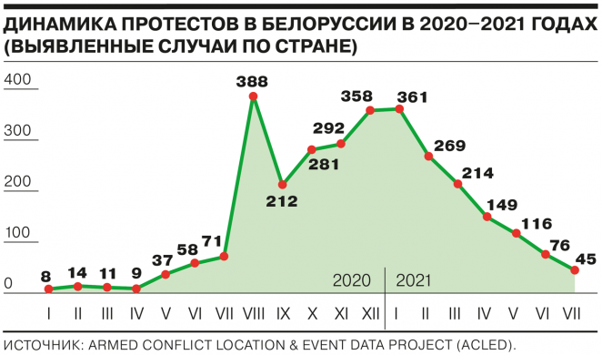 По данным неправительственной организации ACLED, всего с августа 2020 по июль 2021 года в стране прошло более 2,7 тыс. протестных акций.