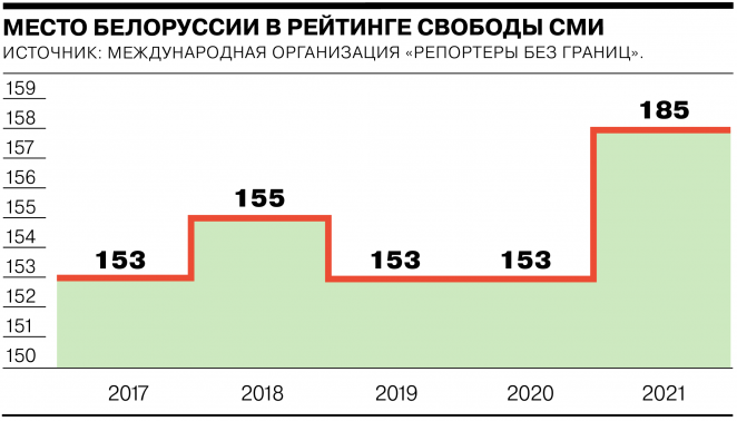 Белорусская ассоциация журналистов за прошедший год зафиксировала почти 500 арестов сотрудников СМИ. Во Всемирном индексе свободы прессы страна опустилась за год со 153-го места на 158-е из 180.