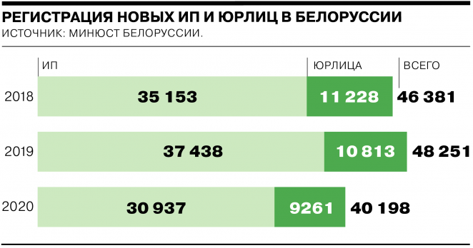Политический кризис сказался и на малом бизнесе. По данным Минюста Белоруссии, в 2020 году в республике произошло резкое снижение регистрации индивидуальных предпринимателей и юридических лиц — почти на 17% по сравнению с годом ранее.