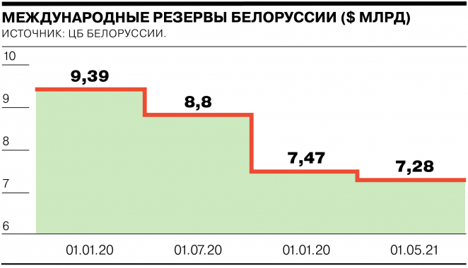 Международные резервы Белоруссии в прошлом году сократились на $1,92 млрд (около 20%). В основном из-за продажи валюты из резервов для поддержания курса белорусского рубля.