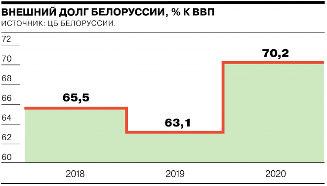 Внешний долг Белоруссии в относительном выражении вырос до 70% ВВП по сравнению с 63% ВВП годом ранее.