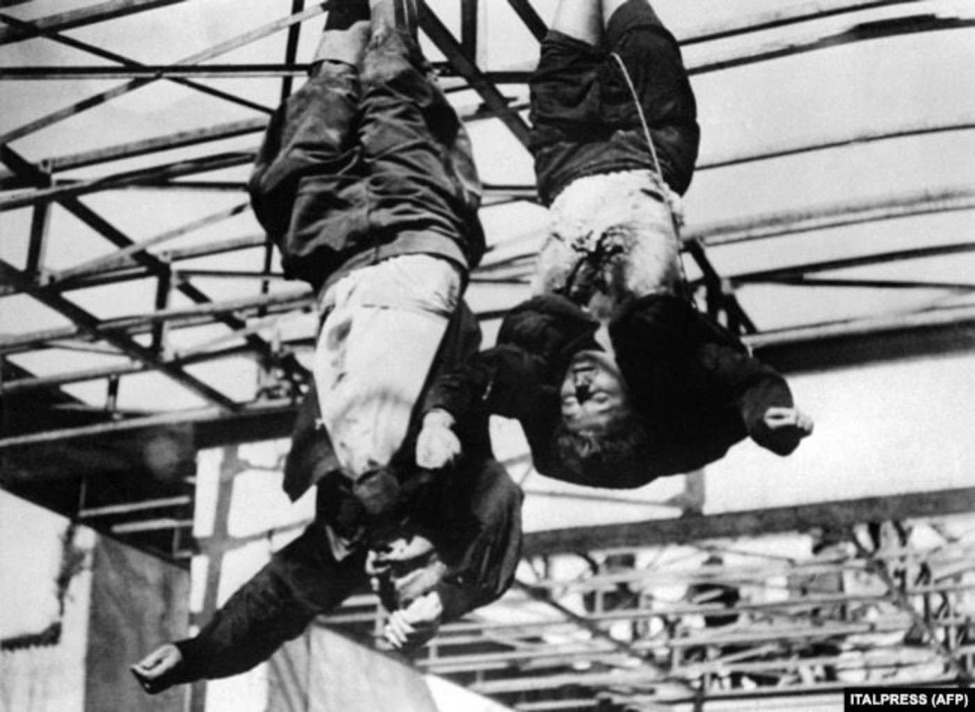 Тела Бенито Муссолини и Кларетты Петаччи, подвешенные за ноги в Милане. 29 апреля 1945 года