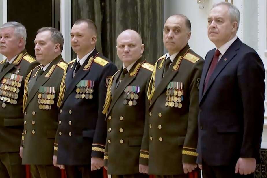 Председатель Пограничного комитета Анатолий Лаппо, министры обороны Виктор Хренин и внутренних дел Иван Кубраков, председатель Комитета государственной безопасности Иван Тертель, государственный секретарь Совета безопасности Александр Вольфович и глава Администрации президента Игорь Сергеенко — слева направо на церемонии у Александра Лукашенко 7 марта. Скриншот видео