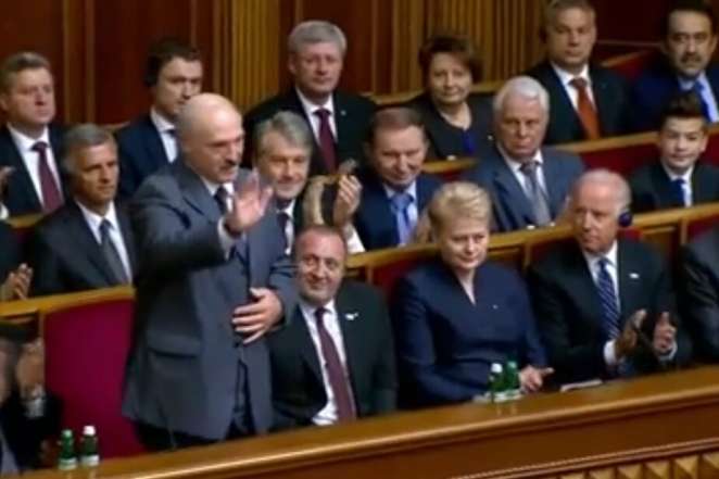 2014 год. Александр Лукашенко прилетел на инаугурацию Петра Порошенко в Киев. Москва считала украинскую власть захваченной в результате государственного переворота. Справа в первом ряду аплодирует Джо Байден. Скриншот из видео