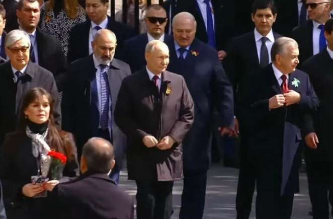 Транспорт медленно следует за политиками. Когда те подходят к воротам Александровского сада, где находится могила Неизвестного солдата, то Путин разворачивается и ждет Лукашенко. Через несколько секунд тот появляется с извиняющейся улыбкой и присоединяется к главам государств.
