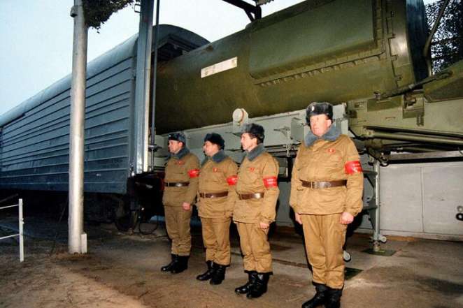 Российские военные охраняют ракету «Тополь» на станции Яцуки перед выводом из Беларуси, 1990-е. Фото: Reuters