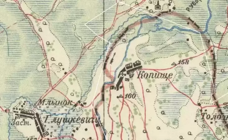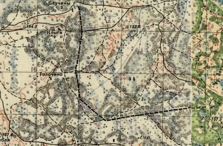Довоенные карты — двухкилометровка и километровка РККА. Тогдашняя граница, обозначенная жирной пунктирной линией, проходила по старице реки Уборть, граница в конце XX века (наложена белая линия) — по лесной просеке далеко от реки