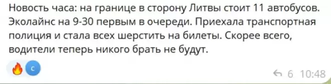 Если верить сообщениям из специальных чатов, сегодня утром при выезде автобуса из Литвы литовская таможня решила проверить, сколько денег провозят пассажиры. Смотрели, чтобы в Беларусь везли не более 60 евро наличными. Якобы 10 человек из автобуса из-за этого высадили и не выпустили из Литвы.