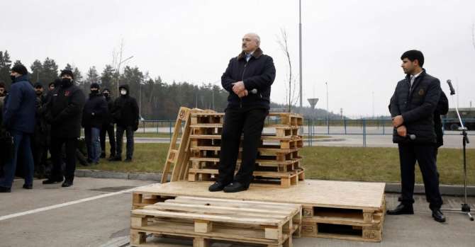 Александр Лукашенко выступает перед мигрантами в транспортно-логистическом центре «Брузги» на беларусско-польской границе в Гродненской области, Беларусь. 26 ноября 2021 года. Фото: Kacper Pempel / Reuters / Forum
