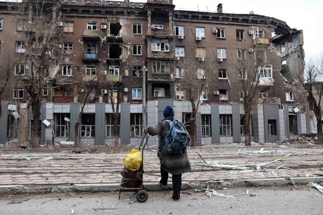 Местный житель смотрит на разрушенный жилой дом в Мариуполе, Украина, 16 апреля 2022 года. Фото: AP / Alexei Alexandrov