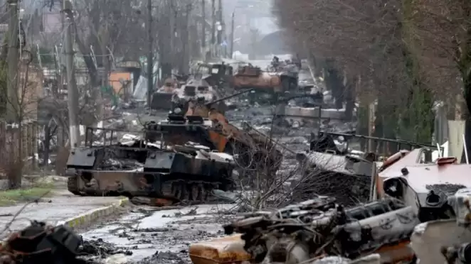 Разгромленная российская колонна в Буче. Фото: BBC / LEE DURANT