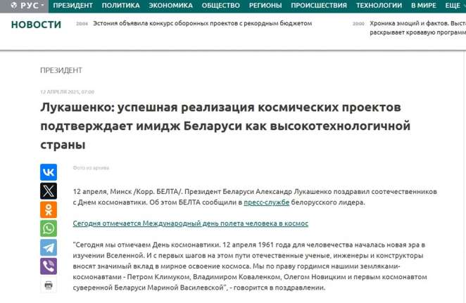 С тех пор Лукашенко то и дело проявляет хладнокровие, когда речь заходит о беларуском космосе. Он и 12 апреля 2025 года не забыл поздравить беларусов с «Днём космонавтики». Причём, сделал это в 7 утра. По крайней мере, именно этим временем датируется информация на сайте БЕЛТА (мы специально сделали скриншот). Видимо, перед тем, как отправиться на ежегодный субботник сажать деревья, Лукашенко посмотрел на безоблачное небо и вспомнил о космосе.
