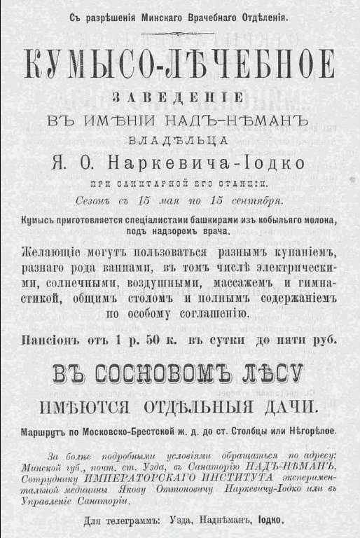 И тогда Якуб Наркевич-Йодко открыл в своей усадьбе санаторий и стал лечить пациентов (которые страдали туберкулезом и нервными заболеваниями) при помощи электромассажа и электротерапии… К слову, пациентам были прописаны не только эти процедуры. Каждое утро они пили минеральную воду из открытой здесь же скважины. А еще Йодко верил в целебность такого напитка, как кумыс. Он даже завез из Башкирии восемь породистых кобылиц, чтобы поставить производство этого напитка «на поток». Бутылки с кумысом щедро раздавались не только пациентам санатория, но и местным крестьянам. Бесплатно.