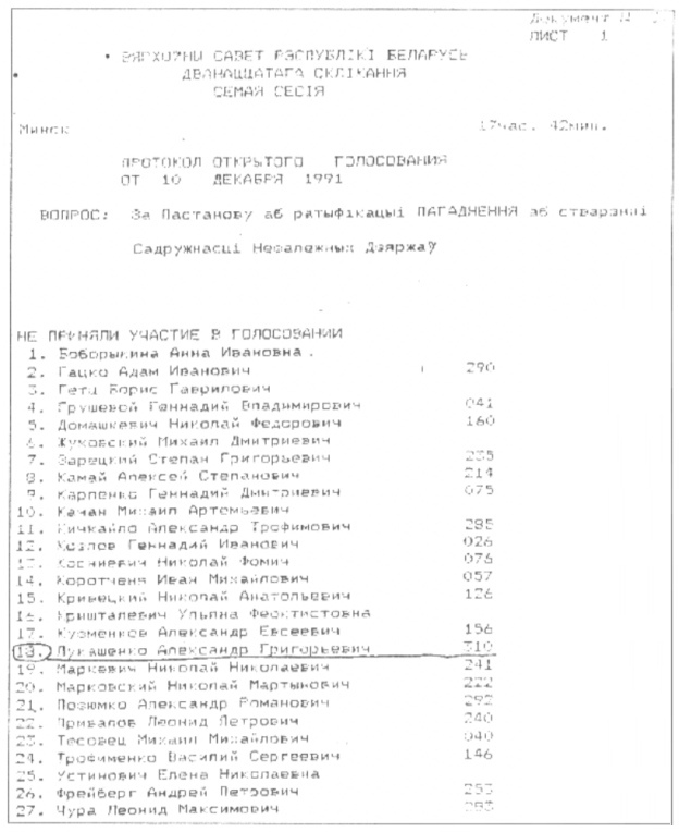 Вот только ещё в 1995 году журналисты независимых СМИ отыскали протокол этого заседания, в котором «черным по-белому» написано, что Лукашенко в тот день на заседании вообще отсутствовал...