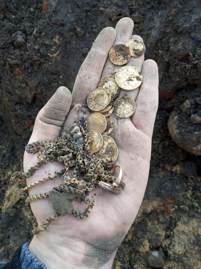 «Обратил внимание на что-то жёлтое в земле, на монету. Подумал, что советский пятак. Присмотрелся -- оказалось, золотая монета с профилем Николая II. Затем ещё одна, ещё... Потом попалась зубная коронка... Стало неловко... Дальше там же выглянула из земли цепь (для цепочки немного великовата), кольцо, и снова монеты, монеты».