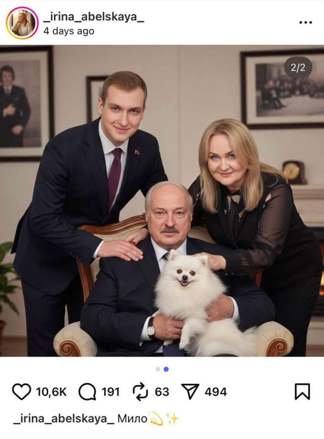 В соцсети неожиданно «завирусилось» фото, выложенное в инстаграме пользователем с ником «_irina_abelskaya_». На нём Александр Лукашенко запечатлён вместе со своим младшим сыном Николаем, любимой собакой Умкой и мамой Коли - бывшим лечащим врачом белорусского правителя Ириной Абельской. Понятно, что это фото сгенерировано ИИ, да и аккаунт в инсте вряд ли принадлежит Абельской...