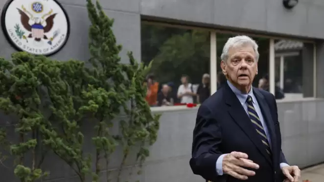 Джон Коул у здания посольства США в Вильнюсе после прибытия в Литву депортированных политзаключенных, 11 сентября 2025 года. Фото: AP