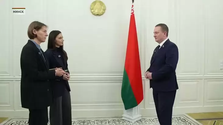 Алина Лаппо (вторая слева) опрашивает премьер-министра Турчина. Из сюжета про ВВП для «РТР Беларусь»