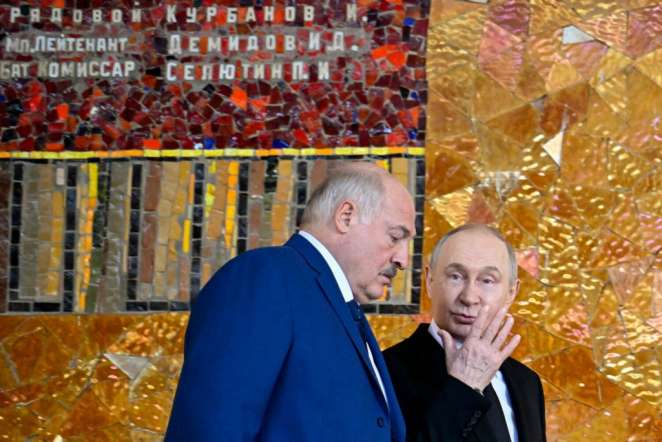 Александр Лукашенко и Владимир Путин на церемонии возложения венков к Вечному огню в Зале воинской славы мемориального комплекса «Мамаев курган» в Волгограде, Россия. 29 апреля 2025 года. Фото: Alexander Nemenov / AFP / East News