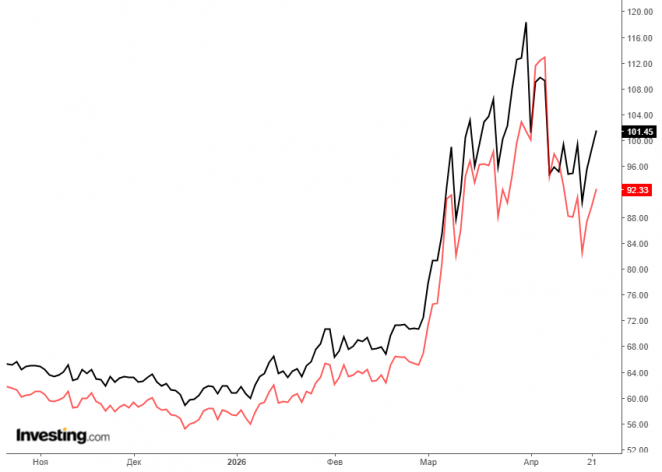 Нефть начала стремительно дорожать в марте после того, как Израиль и США начали бомбить Иран, а тот в ответ заблокировал Ормузский пролив, через который шло около четверти всей нефти в мире. На максимуме баррель марки Brent достигал $118, а 22 апреля она торговалась около $100.