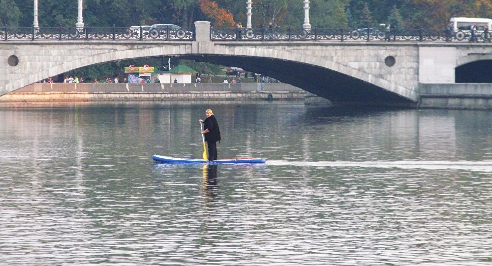 Минчане запечатлели на неделе необычную женщину в столице, которая плыла на доске для серфинга по Свислочи в районе Парка Горького, фото было выложено на одной из страниц в социальной сети Facebook.