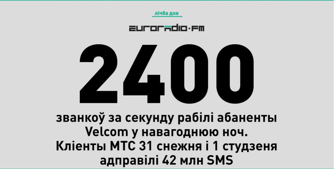 прошло 31 декабря и 1 января через сети двух крупных белорусских операторов: velcom (160 Тб) и МТС (196 Тб). Абоненты МТС за два дня отправили 42 млн SMS. Клиенты velcom в новогоднюю ночь делали 2400 звонков в секунду.