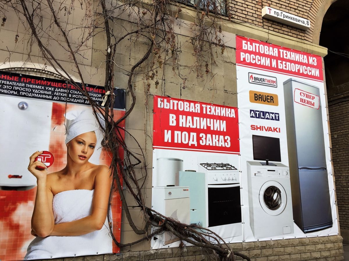 Один из них показывает рекламу бытовой техники из «России и Белоруссии». Еще одно предложение белорусского товара — сыр, который делают в Кобрине.