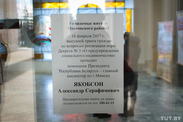 Предварительно на прием записалось 14 человек, однако желающих попасть к Якобсону оказалось в несколько раз больше. Минчане приходили и занимали живую очередь под дверями кабинета. В итоге вместо запланированных трех часов прием продлился пять. Пообщаться с помощником президента смогли 36 человек. На встречу приезжали люди со всего города, а не только из Московского района. Некоторых исполкомы ранее уже отказались освобождать от уплаты сбора, но они решили попытать счастья еще раз, на этот раз в присутствии чиновника из Администрации президента.