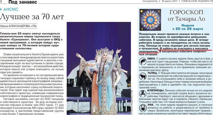 В соцсетях уже появился скриншот последней страницы газеты. Пользователи шутят и строят догадки, могут ли звезды рекомендовать одно и то же сразу всем знакам зодиака. Пикантности ситуации добавляет еще один факт — на 25 марта в Гомеле объявлен субботник. Теперь некоторые посетители соцсетей в раздумьях, стоит ли им после таких предсказаний идти на массовую генеральную уборку.