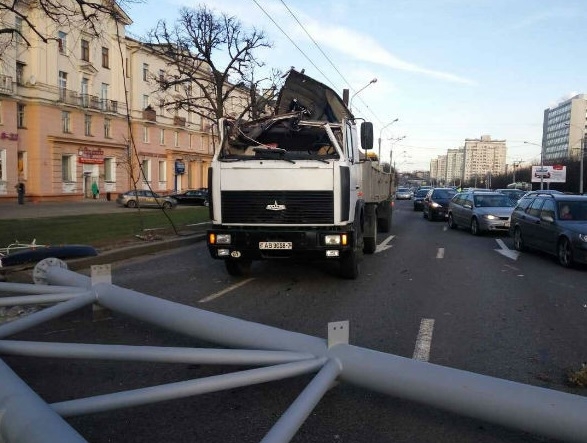 На Партизанском проспекте упавшая с МАЗа металлическая балка снесла кабину другому грузовику