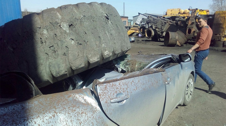 Видеофакт: взорвавшееся колесо от БЕЛАЗа расплющило Toyota в Кузбассе