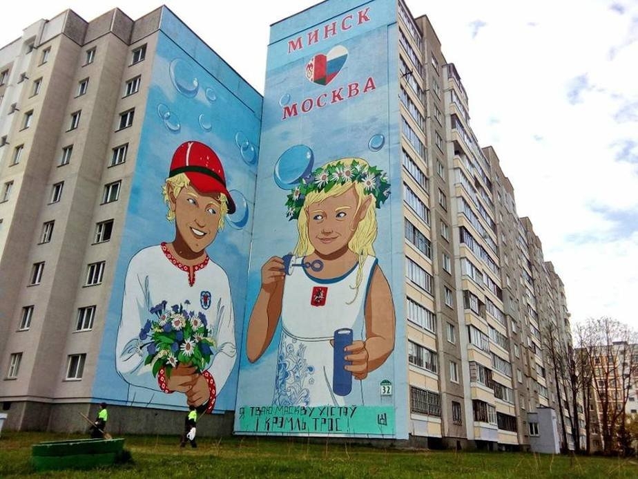 На граффити “дружбы Беларуси и России“ поверх закрашенной надписи протеста появилась новая