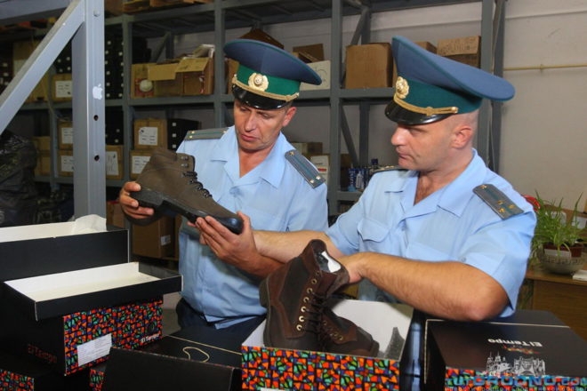 Белорусские таможенники изучают партию контрабандной обуви. Фото: tutgrodno.com