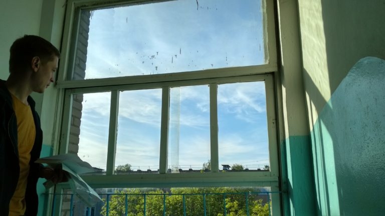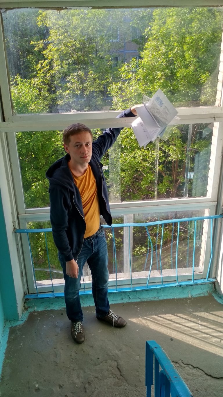 Олег Кветинский в своем подъезде. Согласно документам стекло в окна будто бы вставили, правда через такое невидимое стекло проходит человеческая рука