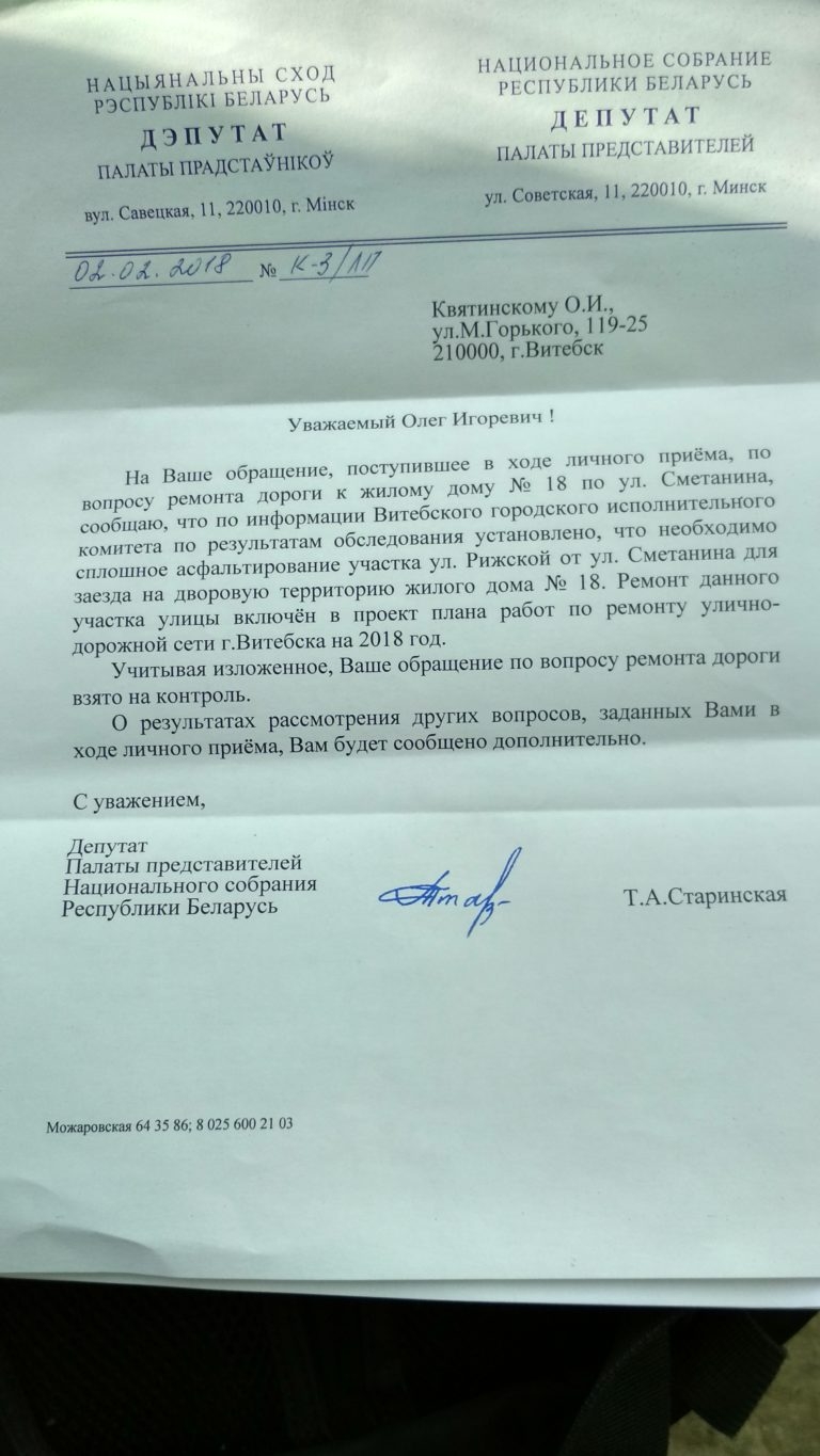Еще зимой Олег обратился к депутату Палаты представителей Национального собрания Республики Беларусь Татьяны Старинской с просьбой провести ремонт окон в подъезде № 2 в доме № 119 по улице М. Горького в Витебске. Депутат передала обращение Государственному предприятию «ЖРЭТ г. Витебска» и поручила восстановить недостающее остекление в оконных рамах в феврале того же года.
