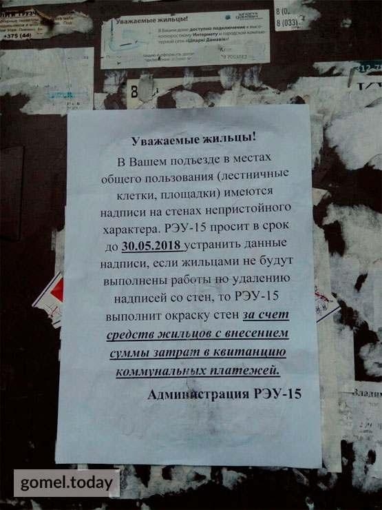 Сотрудники РЭУ-15 потребовали от жителей, чтобы те самостоятельно закрасили неприличные слова на стенах на лестничных клетках и площадках до конца мая, сообщает сайт gomel.today.