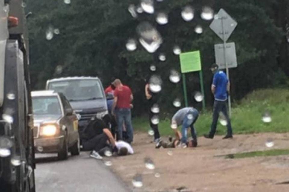 На железнодорожном переезде опустился шлагбаум и такси остановилось. К нему подъехал микроавтобус, из которого выбежали люди в бронежилетах и в масках. Один из них, как впоследствии оказалось — омоновец, метровой монтировкой разбил лобовое стекло такси.