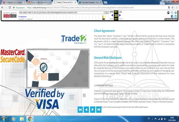 В апреле этого года сайт банковской информации «Инфобанк» сообщил, что в Национальный банк пачками приходят письма возмущенных граждан Беларуси, пытающихся опротестовать операции по банковским платежным карточкам. Суть в том, что с помощью карточек белорусские инвесторы перечислили международной компании Global Fin Services Limited (торговая марка «Trade12») больше миллиона долларов «для игры на рынке Форекс».
