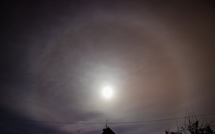 «Наблюдая Луну этим вечером, я заметил, как среди облаков, окружающих Луну, появилось оптическое явление — неяркий круг правильной формы, — написал он. — Это лунное гало! Свет, отраженный и преломленный содержащимися в облаках ледяными кристаллами, формирует такое удивительное атмосферное явление».