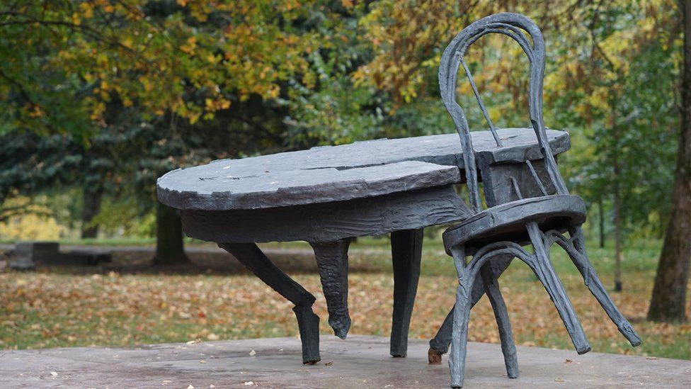 В сквере неподалеку от минского вокзала и вблизи станции метро "Фрунзенская" можно наткнуться на пронзительный мемориал: круглый стол, расщепленный глубокой трещиной, готовый опрокинуться стул. Архитектор Леонид Левин и скульптор Максим Петруль установили этот знак 10 лет назад, к 65-ой годовщине ликвидации Минского гетто.