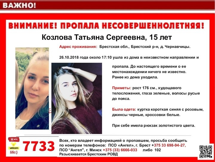 Девушка находится в розыске с 26 октября. Около 17.10 она ушла из дома в деревне Чернавчицы Брестского района. До настоящего времени о ее местонахождении ничего не известно. Ранее она неоднократно уходила из дома.