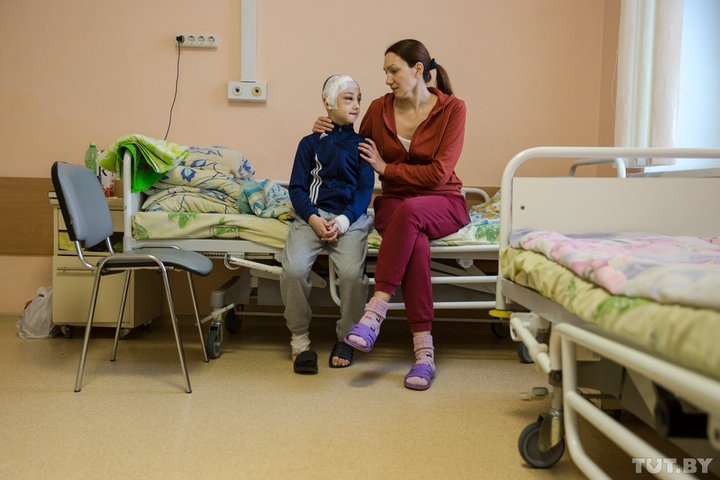 Влад, 8 лет, вместе с мамой Юлией в РНПЦ неврологии и нейрохирургии в Минске. 7 января он получил травму головы, катаясь с горки на тюбинге. Сейчас с мальчиком все хорошо, и он идет на поправку. Фото: Дарья Бурякина, TUT.BY