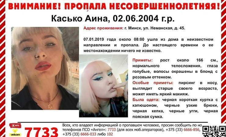 Всех, кто знает о ее местонахождении или может поделиться другой полезной информацией, просят позвонить по телефонам ПСО «Ангел» 7733 (для всех мобильных операторов) либо (+375 33) 666-68-56, (+375 33) 666-60-33 либо 102.