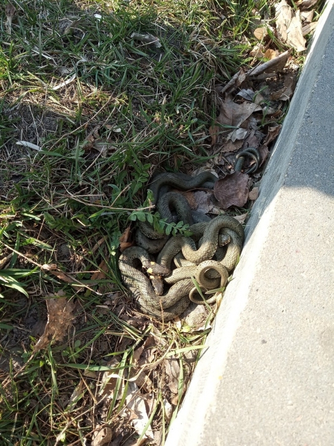 Фото и видео с сонной компанией ужей появились в сообществе «Подслушано Пинск».